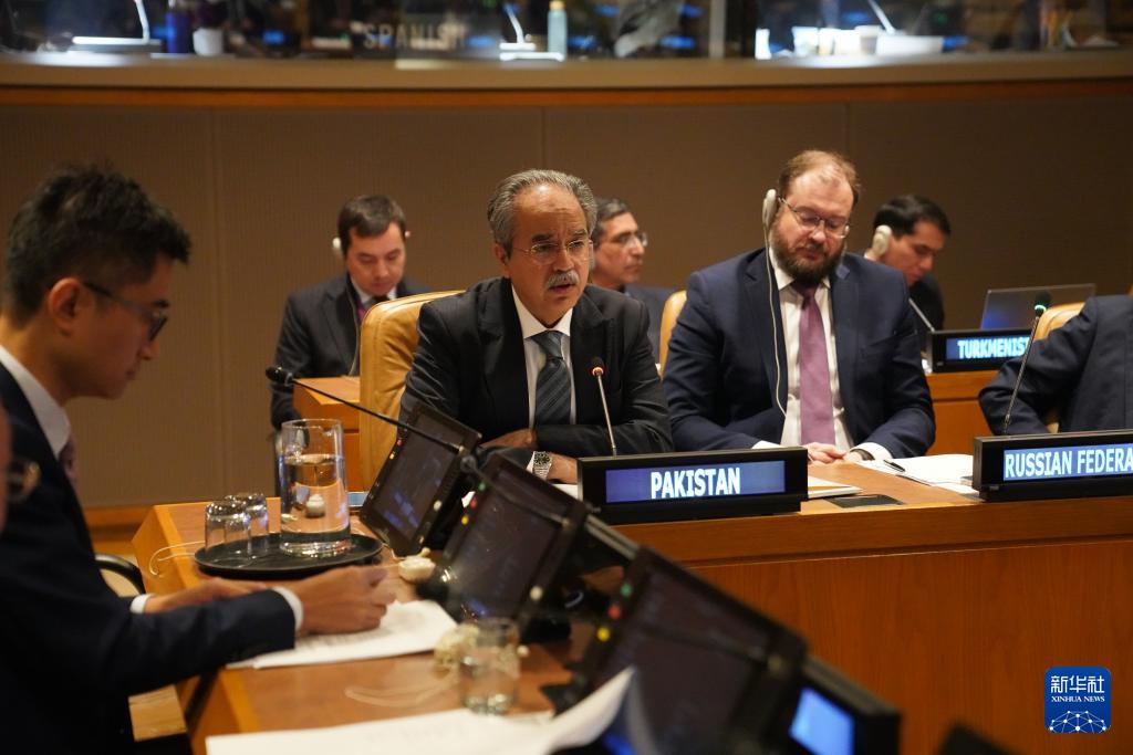 10月27日,在位于纽约的联合国总部,巴基斯坦常驻联合国代表阿西姆·伊夫蒂哈尔·艾哈迈德(中)在“纪念台湾光复80周年,维护联大第2758号决议权威”会议上发言。新华社记者 张凤国 摄