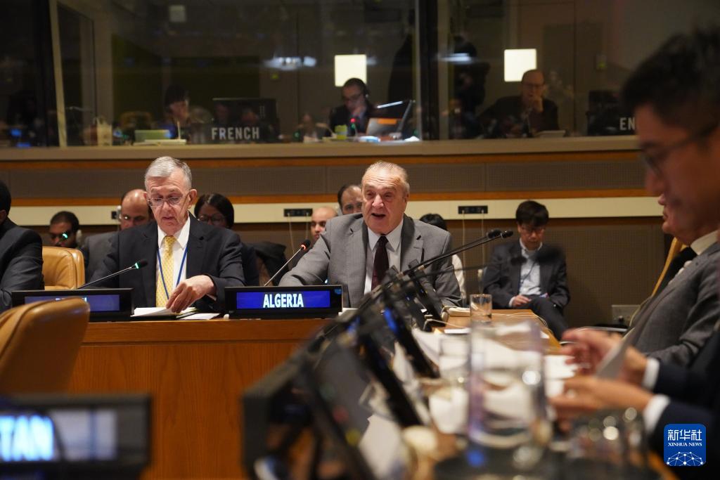 10月27日,在位于纽约的联合国总部,阿尔及利亚常驻联合国代表阿马尔·本贾马(中)在“纪念台湾光复80周年,维护联大第2758号决议权威”会议上发言。新华社记者 张凤国 摄
