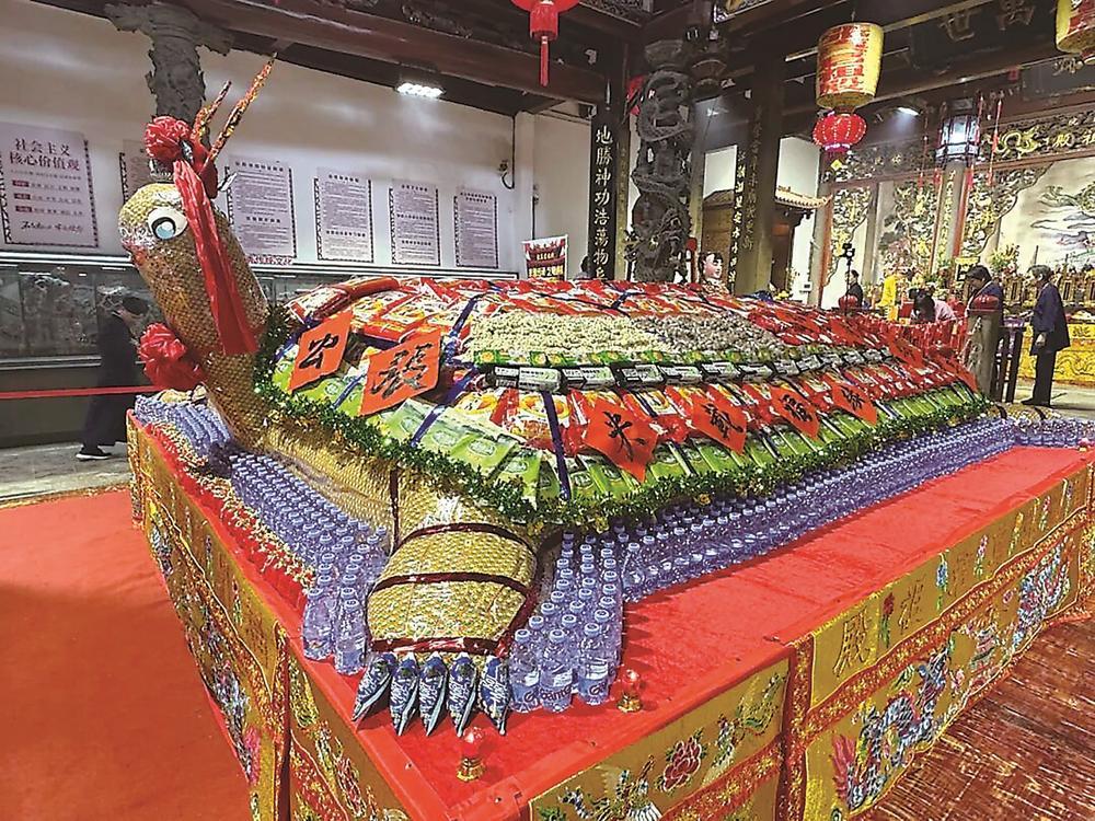 东南网11月24日讯 (福建日报记者 汪洁 文/图) 近日,一只由8444公斤大米堆成的巨型米龟在福州上下杭张真君祖殿亮相(如图),吸引大批市民和游客驻足观赏。这是台湾米龟传承工匠团队首次在大陆制作巨型米龟,彰显了两岸信俗文化的深度交融与情感共鸣。 活动现场,红枣、桂圆、花生与“平安米”一层层叠筑构成这只米龟,信众围绕米龟祈愿,了解张圣君传说和“米龟祈福”民俗,感受中华传统文化的魅力。 “米龟代表平安、长寿,承载着百姓祈求风调雨顺、阖家幸福的朴素愿望。”台湾米龟传承工匠团队负责人肖涌达说,清代米龟文化从福建传入台湾,至今仍在台湾宫庙广泛流传。他是台湾米龟技艺第三代传承人,去年因参加张圣君信俗文化交流活动与福州结缘。今年,团队4人专程来榕,用3天时间制作这只巨型米龟。 据悉,这只巨型米龟将展出至12月22日,结束后将以“祈福米”的形式分送给群众。 |