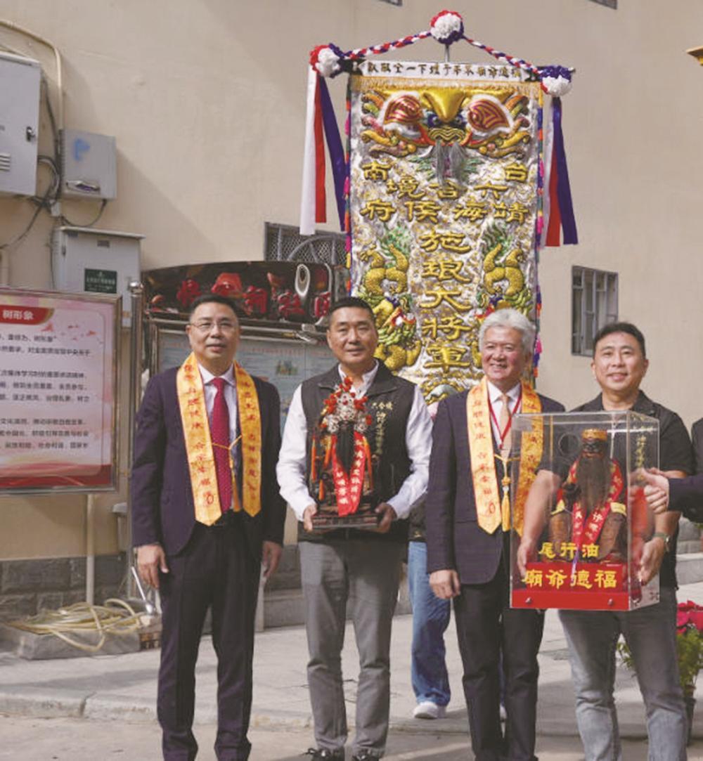 ▲厦门市姓氏源流研究会施氏委员会会长施性勤(左一)与台南福德爷庙主委张天建(左二)一行合影。