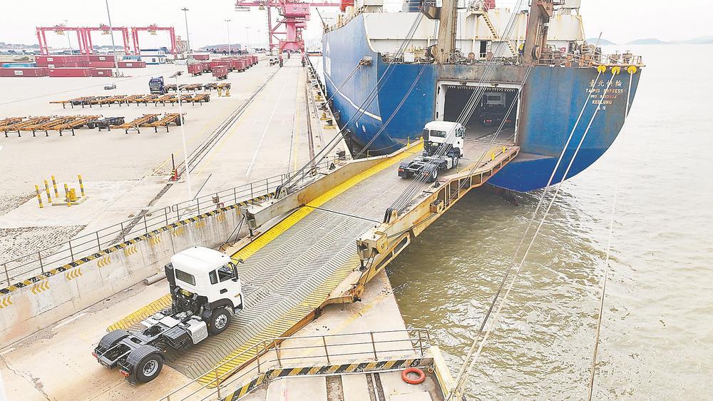 6日,在平潭口岸金井港区,5个重型卡车车头顺利办结通关手续,搭乘“台北快轮”运往台湾台北港,这是平潭口岸首次向台湾发运重型卡车车头。