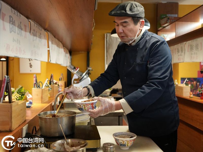 2026年1月9日,陈文建在店里给食客准备卤肉饭。(中国台湾网发)