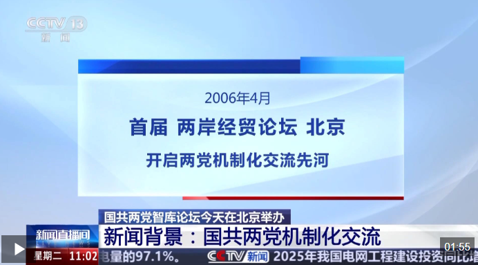 2006年4月,国共两党在北京举行首届两岸经贸论坛,开启两党机制化交流先河。首届论坛以"两岸经贸交流与直接通航"为主题,达成推动两岸直航、实现大陆居民赴台旅游等7项共同建议,大陆方面宣布承认台湾学历等15项惠台政策措施,充分表达对台湾同胞的诚意和善意。