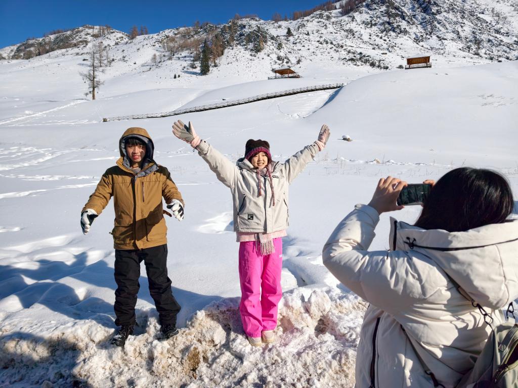 1月30日,台湾青年在新疆喀纳斯景区的雪地里拍照。新华社记者 贺小童 摄