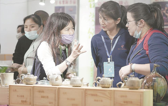 一位台湾参展商(左)在介绍公司生产的特色茶具。 本报记者 王毅 摄