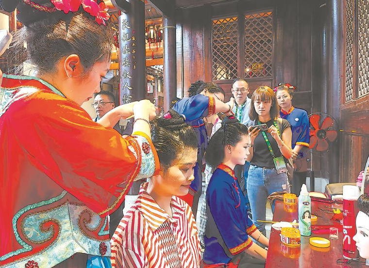 两岸媒体人采访并体验梳妈祖髻。 东南网5月2日讯(福建日报记者 刘深魁 文/图) 4月29日至5月1日,“三月廿三媒体湄洲行”联合采风活动在妈祖文化的发源地——莆田湄洲岛举行,来自海峡两岸的30多位媒体记者参加活动,深入了解妈祖文化的起源及妈祖信俗传承创新之道。 穿妈祖服、吃妈祖面、梳妈祖髻……连日来,两岸媒体人走进湄洲岛大街小巷,体验“天下妈祖回娘家”“妈祖诞辰”系列活动盛况,感受“天下信众一家亲”的血脉亲情。同时,两岸媒体还采访报道了莆田探索海峡两岸融合发展新路、践行“两岸一家亲”的创新举措。 “妈祖文化是中华优秀传统文化的重要组成部分,历经千年的传播与传承,是促进两岸同胞心灵契合的重要精神纽带,也对东亚海洋文化、海上丝绸之路沿线国家和地区的人文交流产生了重要而深远的影响。”湄洲妈祖祖庙董事会董事长林金赞表示,希望通过两岸媒体的力量,进一步扩大提升妈祖文化的朋友圈和影响力。 在台湾电视媒体人赖正凯看来,媒体可以通过年轻人喜闻乐见的方式传播妈祖文化,只有让更多的年轻人了解并产生兴趣,妈祖文化才能更好地传承和弘扬。“我在台湾参加过很多妈祖信俗活动报道,这次来妈祖故乡感到特别高兴,收获也很大。”赖正凯说,台湾有许多妈祖信众,透过妈祖这位“海上和平女神”,两岸年轻人能够增进了解、加深友谊。 “这是我第四次来到湄洲岛,每次都有新的变化。妈祖信仰是很多台湾民众根深蒂固的信仰,来到祖庙对每个台湾人来说都意义非凡。”台湾资深媒体人宋智忱说,这次探访妈祖文化发源地,更能感受到两岸交流合作的必要性,也期待更多台湾民众有机会多来福建走走看看。 |